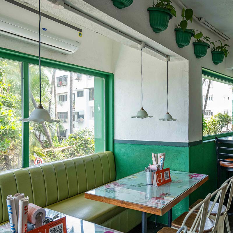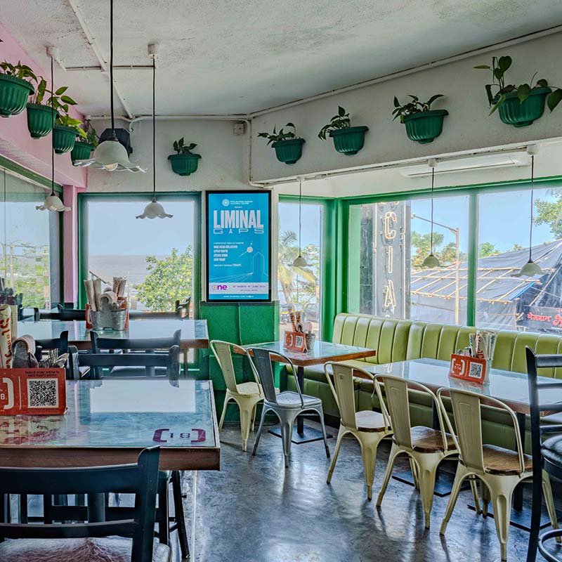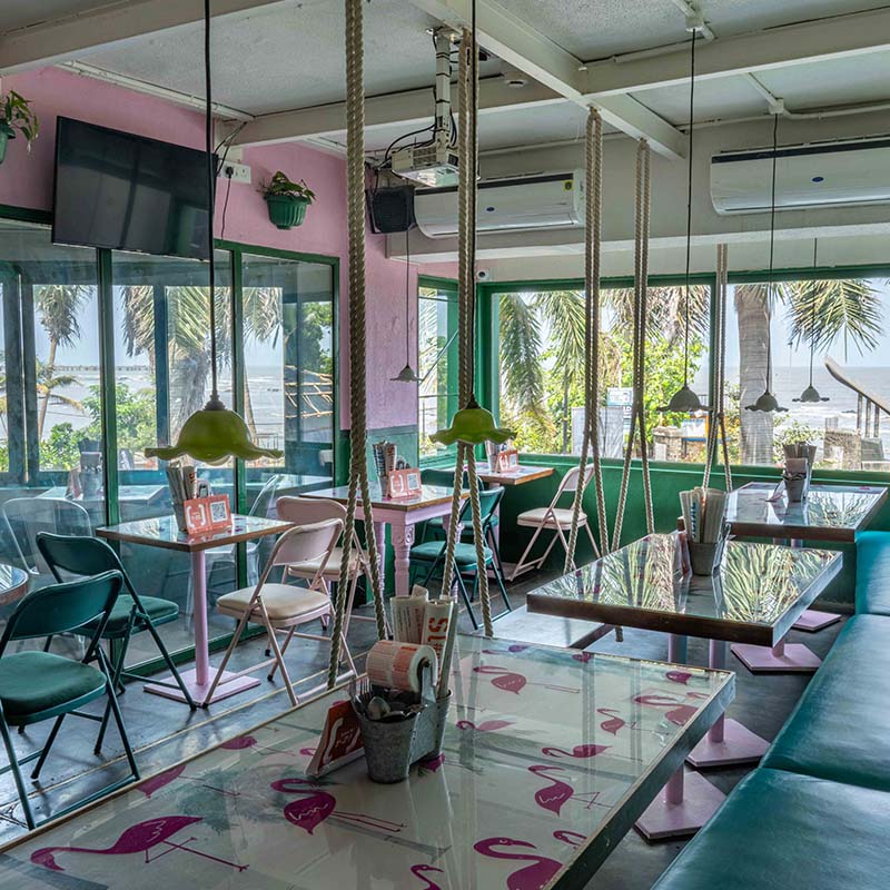 True to its iconic location, the outlet is designed with the intention of breathing sun, sand and sea into every nook and cranny of its space. The kitsch-meets-sparkling neon signage is complemented by summery pastel shades of baby pink & variants of green, and flanked by embroidered cane-like chairs alongside comfy lounge seating. The walls, patterned with tropical motifs, also boast some killer artwork by Manipuri artist Sony Thokchom!