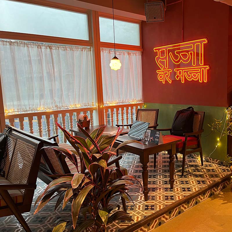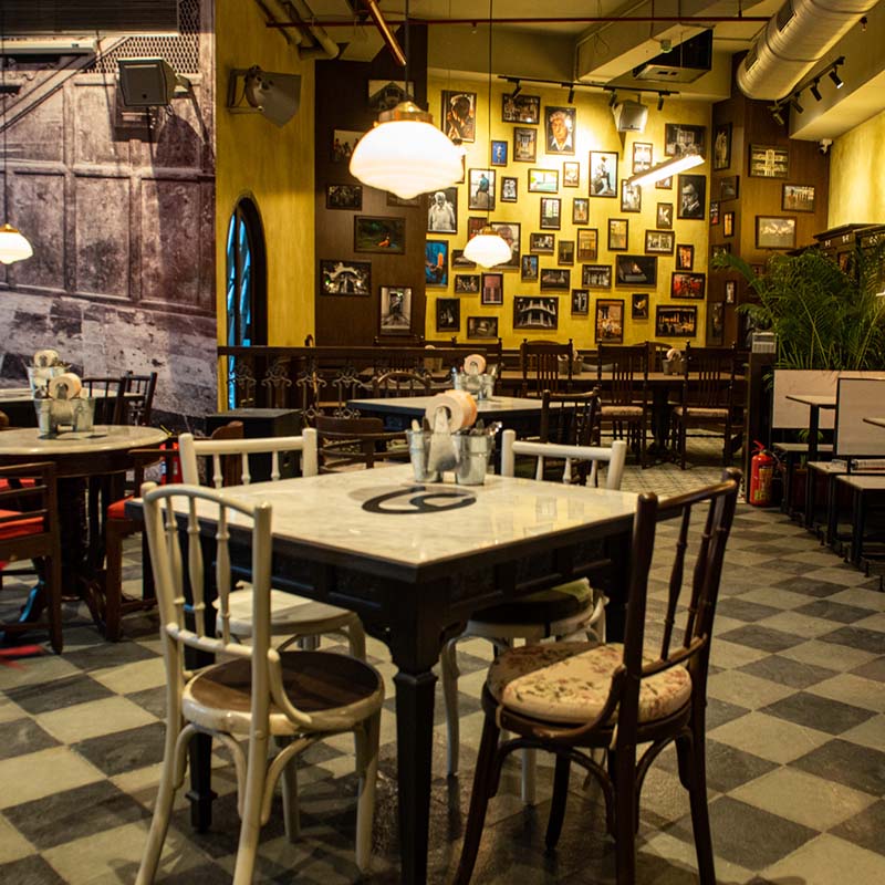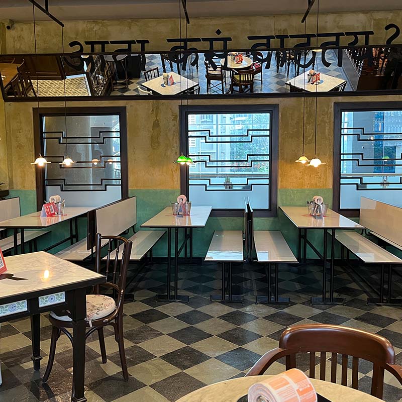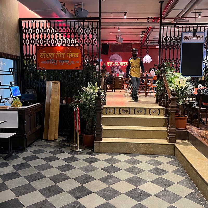 The outlet integrates the zest of its surroundings. The design is spread over multiple zones, each paying tribute to the evergreen soul of Dadar. Inspired by the Mitramandal theme, the first zone is a high-energy space complete with the DJ console and modern twists on old-world charm.