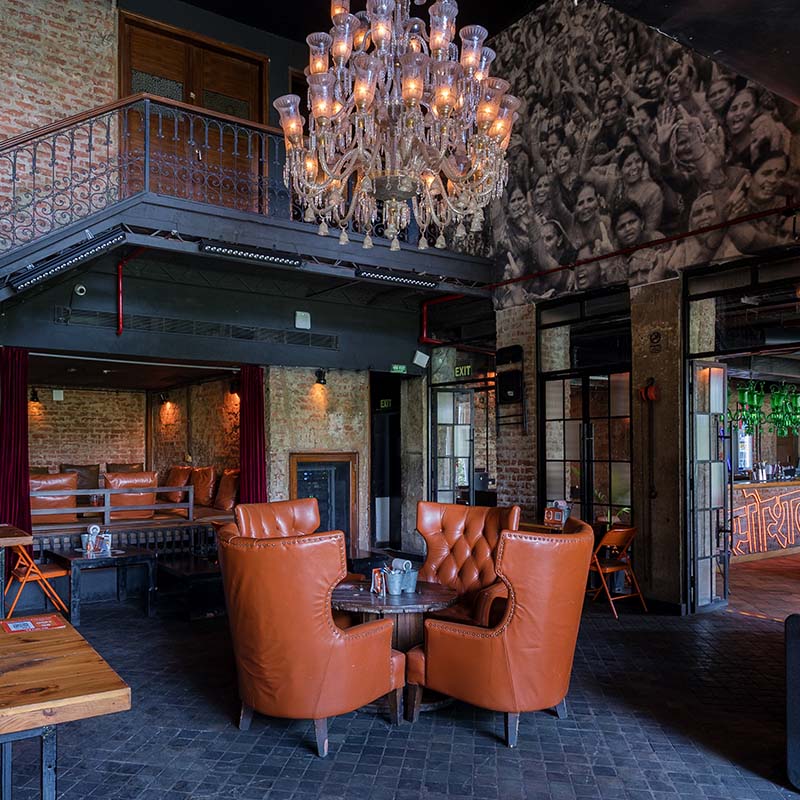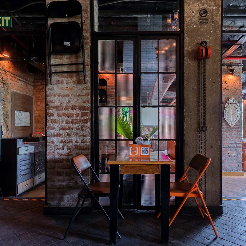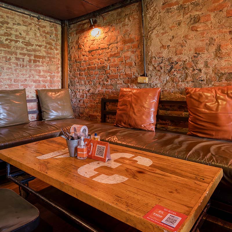 Rugged yet effortlessly stylish with 100% recycled and upcycled furniture juxtaposed with hard industrial elements, Social makes an anti-design statement and looks like it’s straight out of the Meat-Packing District in New York. Unfinished bare walls are eased in with plush leather sofas. Skeletal table clamp lights add strong lines to the large communal tables and naked bulbs dangle from the ceiling.