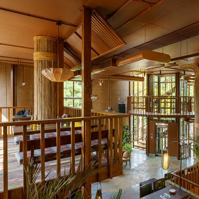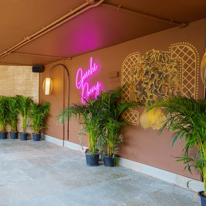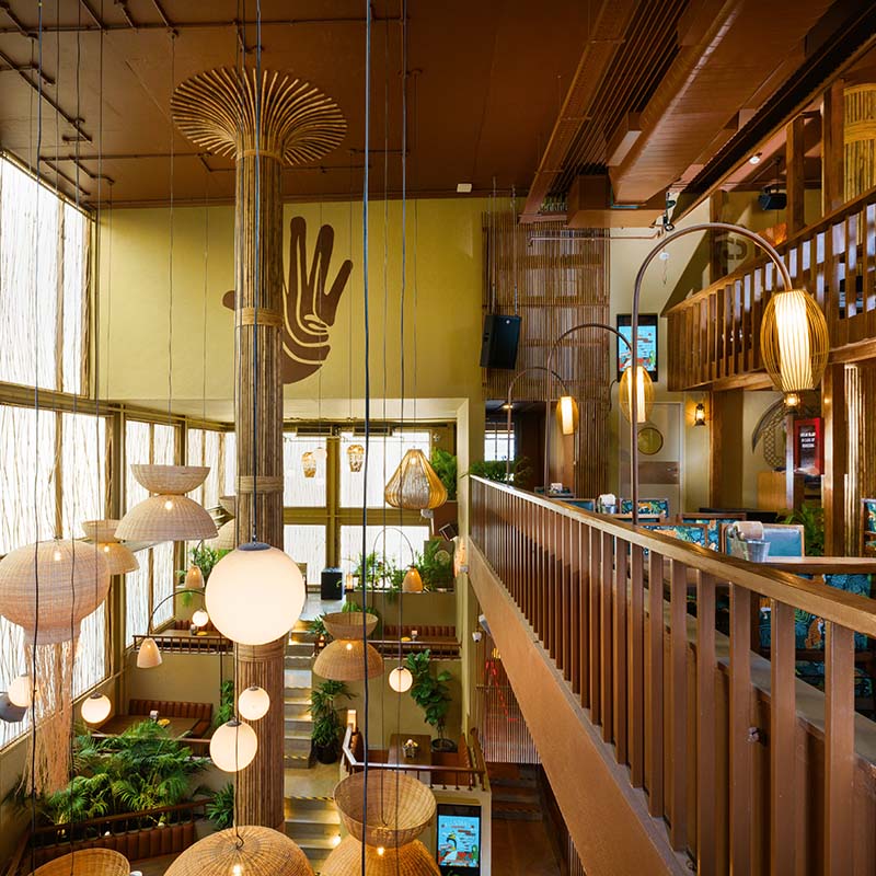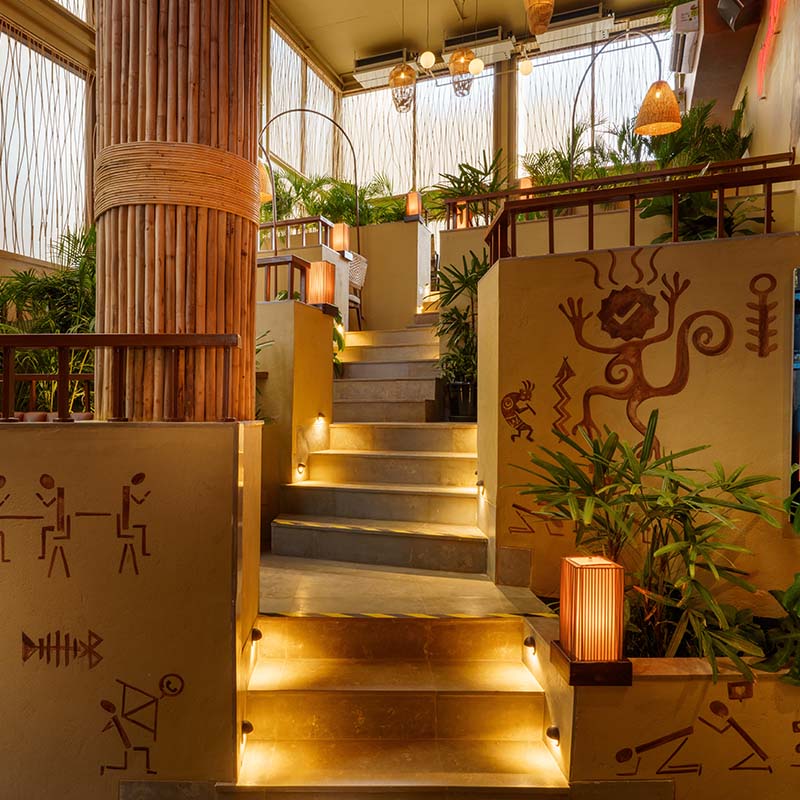 Our first stand-alone outlet, JP Nagar Social, is inspired by Mother Earth. It is a rammed-earth building and a multi-story destination that boasts several unique features: a waiting area sprinkled with bean bags, an amphitheater-style seating area, a staircase snaking around the lift to offer the best views of both SOCIAL and the city beyond, co-working spaces, and a terrace. You’ll notice clay walls, cane lamps, SOCIAL media-inspired cave paintings, an abundance of potted greenery, and bamboo pillars.
